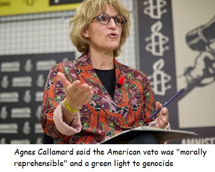 “It is morally reprehensible that instead of using its leverage to halt the endless catalogue of horrors, the USA has – yet again – abused its veto rights to effectively further greenlight Israel’s genocide against Palestinians in Gaza,” said Amnesty International’s Secretary General, Agnès Callamard.